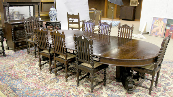 A good quality reproduction oak extending dining table, circular top with extra leaf, on baluster-turned legs with cross- A set of four Edwardian walnut dining chairs, with bobbin-turned pedestal table with extra leaf and a sideboard, three drawers above cupboards, 4ft. 10in. ... Retrieve Content